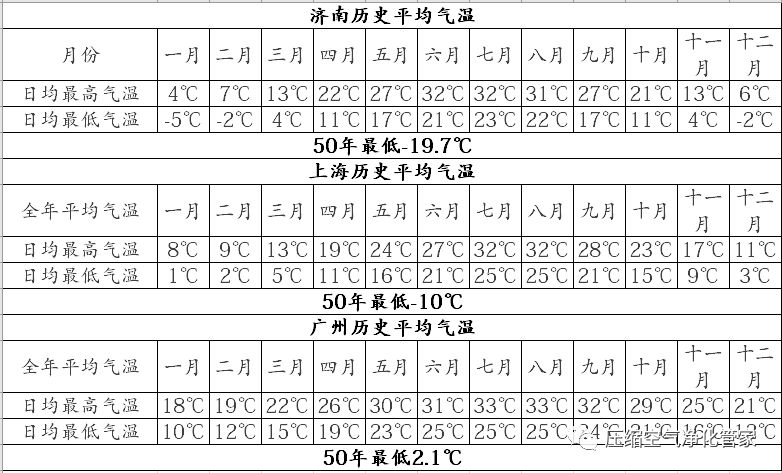 清楚這層關系那么我們就知道末端不出水,就是需要當前干燥機工作時排氣壓力露點溫度,不能低于當前環境溫度。既然涉及到環境溫度,我們就選取極具代表性的黃河流域,長江流域和珠江流域三地各取一個地區作為對比:黃河流域,濟南;長江流域,上海;珠江流域;廣州。查取近50年三地平均氣溫為下表。