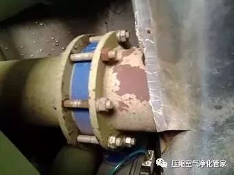 該機型如不帶加熱器,大多數場景溫度均為110~140之間,所以該機型應該全部選擇雙偏心蝶閥。有很多時候空壓機排氣溫度為110附近,那么有的廠家就會選擇EPDM中線閥,因為理論上此閥門耐溫等級是120℃??墒?10℃溫度已經接近該閥門的極限溫度,長時間使用仍然會出現問題,見下圖,某廠家的圧縮熱吸干機,采用的中線閥,一年不到,到處串氣。